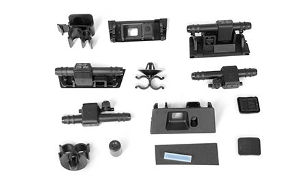 Komponenten für Scheiben- und Scheinwerferreinigungssysteme, Pumpengehäuse, Spritzdüsen, Verbindungselemente, Anschlussstücke Steckergehäuse Eingesetzte Materialien: |